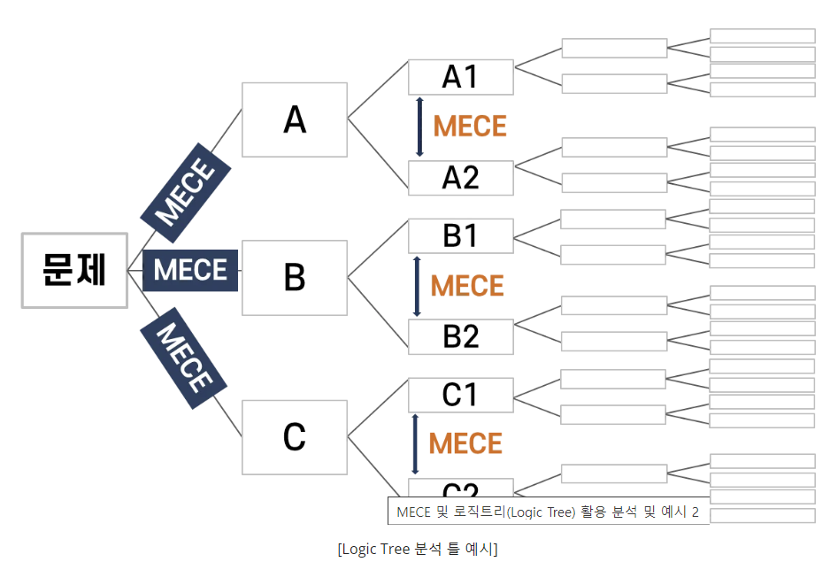- MECE(상호배타적, 전체포괄적) 원칙에 따른 빠짐없는 아이디어 정리